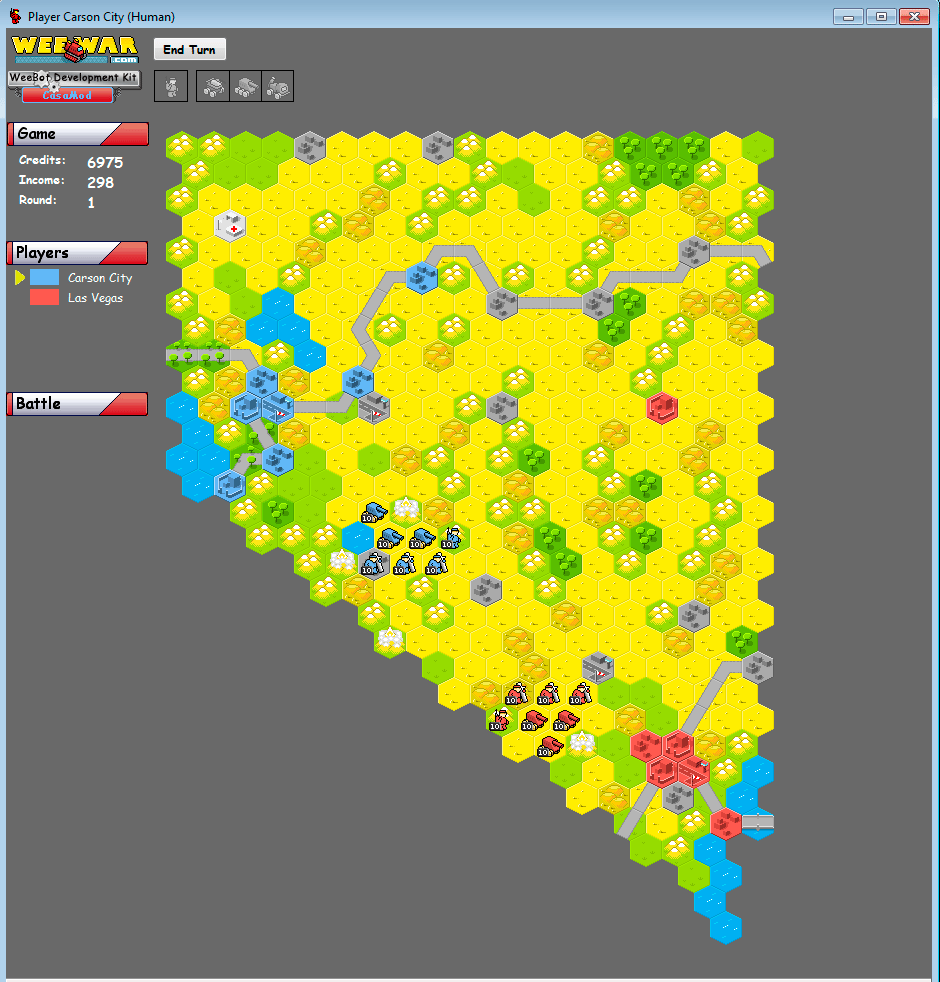 concept: Just added the casamod terrains roads, hills, towns and peaks to the original map of Myliverhatesme's original map. Also moved some bases a bit and added some more towns like Austin to areas where no one would send units otherwise. There is many credits out there and both players get 2 airfields, so there will be some intense dog fighting above the desert.
